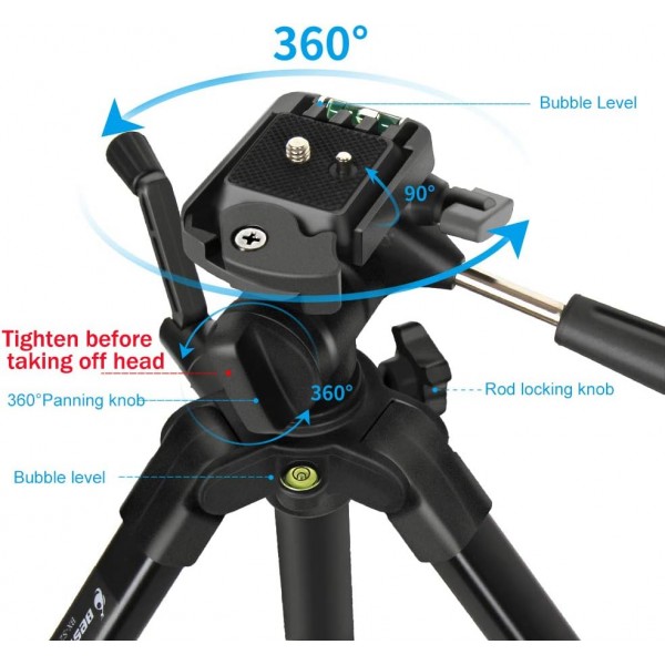 - Pan Head Tripod 3-Way with Level Bubble - 360 degree panning and titling with horizontally and vertically, easy to change directions at different angles.