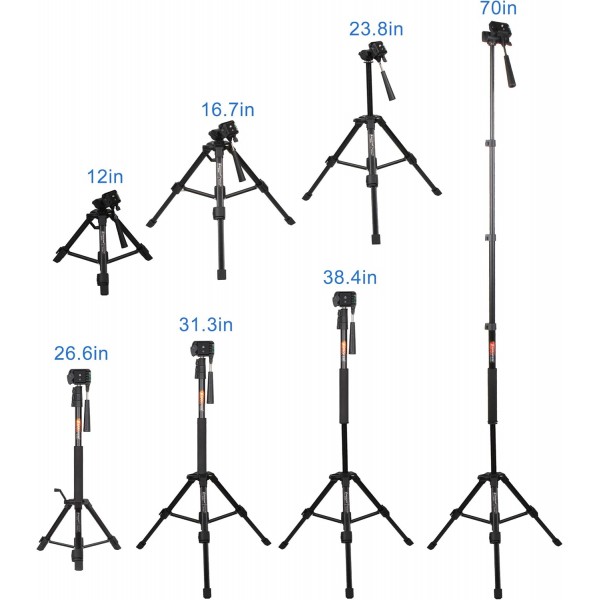 - 【Not for Big DSLR Camera, but Small Mirrorless Camera】Less Space Occupy - This compact camera tripod stand expanded diameter of the base is 15.7 - 23.6 inch, so it's very useful when there is not enough space for large tripod such as at school sport, ball games, live concert etc. Portable Lightweight Tripod for Travel Max height is up to 177cm/70 inches. Max load weight is 5kg/11lb. Comes with a convenient carrying bag.
